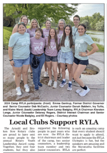 The Arnold and Broken Bow Rotary clubs are proud to have sent so many people to the annual Rotary Youth Leadership Award camp. Together, they sent four students: Emma Gentrup, Ivy Tullis, Klaire Ward, and Eli Rogers, but they also supported the following people in the past years who are now: The RYLA district chairman and leader of the camp, Kiersten Lange; two senior counselors, Deb McCaslin and Nicole Badgley; a leadership team member, Laney Badgley; and two junior counselors, Danah Baldwin and Delaney Rogers.